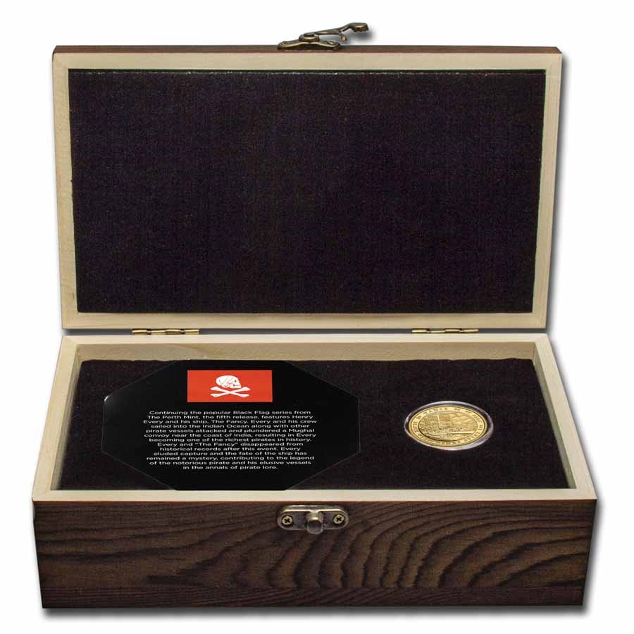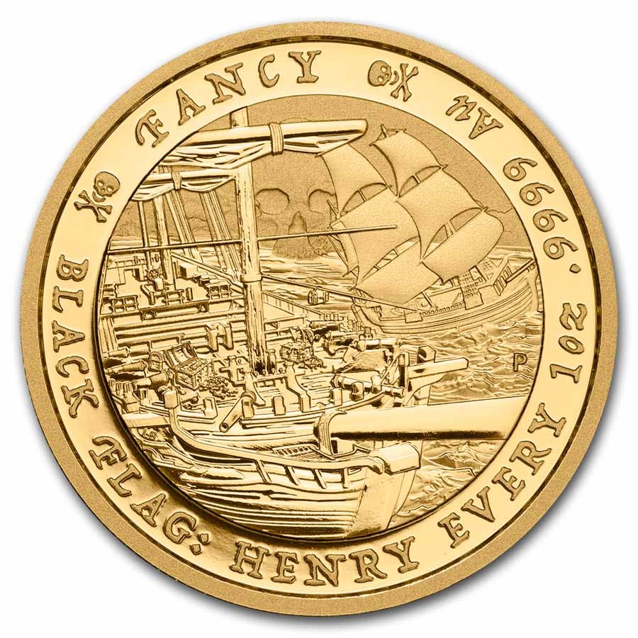 – **Faszinierendes Motiv:** Die Rückseite der Münze präsentiert eine atemberaubende Darstellung des geplünderten Schiffes “The Fancy” von Henry Every. Auf dem Schiffsdeck sind prall gefüllte Truhen mit Münzen und Juwelen zu sehen, während am Horizont das Symbol eines Totenkopfes erscheint. Zusätzlich zieren die Inschriften “FANCY”, “BLACK FLAG: HENRY EVERY”, Gewicht, Feingehalt und das traditionsreiche Münzzeichen “P” der Perth Mint dieses fesselnde Bild.