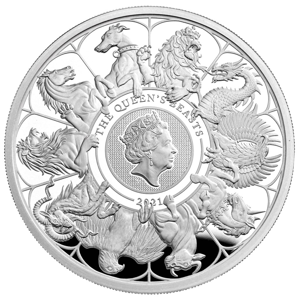 Die Rückseite ist ein wahrhaft königliches Meisterwerk, das das beeindruckende Bildnis Ihrer Majestät in der Mitte zeigt, flankiert von den Königinnen der gesamten “Queen’s Beasts”-Serie. Zusätzlich prangen die erhabenen Inschriften “THE QUEEN’S BEASTS” und “2021” – das Jahr der Ausgabe.